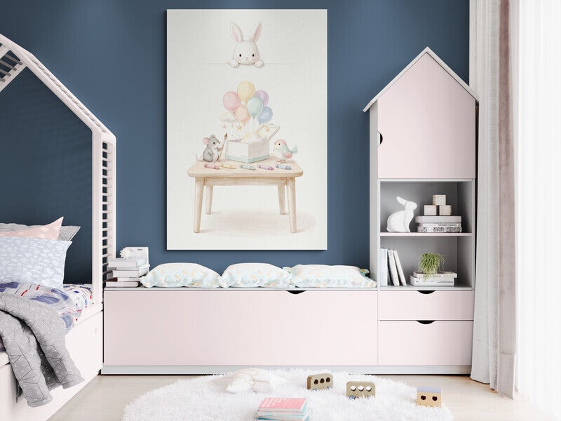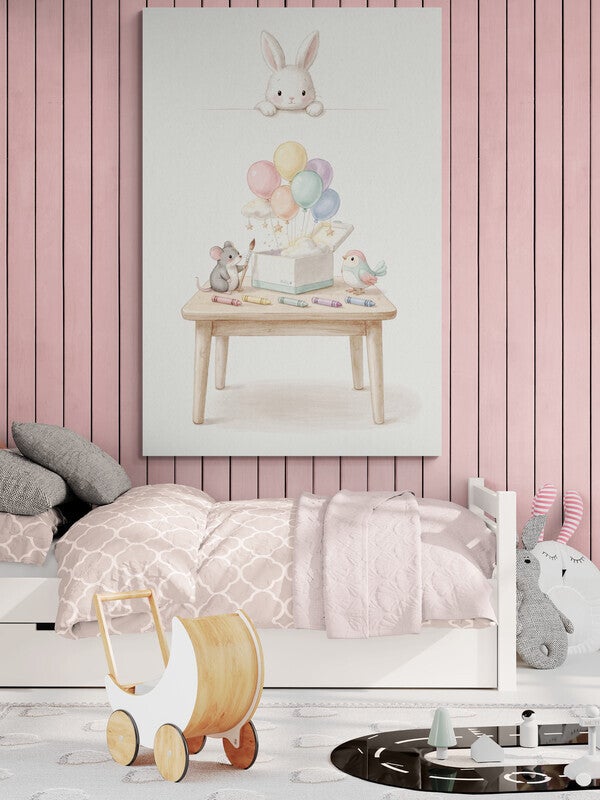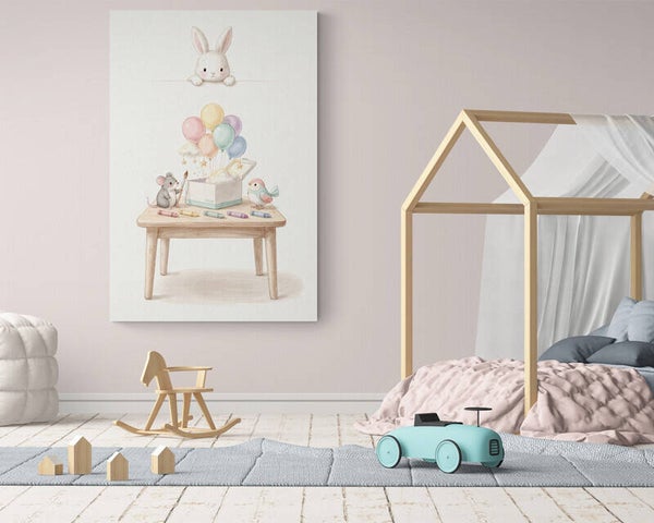 Een zacht en speels kunstwerk waarin een nieuwsgierig konijntje van bovenaf meekijkt naar een tafeltje met een open doos vol zwevende ballonnen. De kleine muis met penseel en het vogeltje zorgen voor een creatief en vrolijk tafereel. De handgeschilderde uitstraling en de rustige achtergrond maken dit schilderij perfect voor een lieve en dromerige kinderkamer.