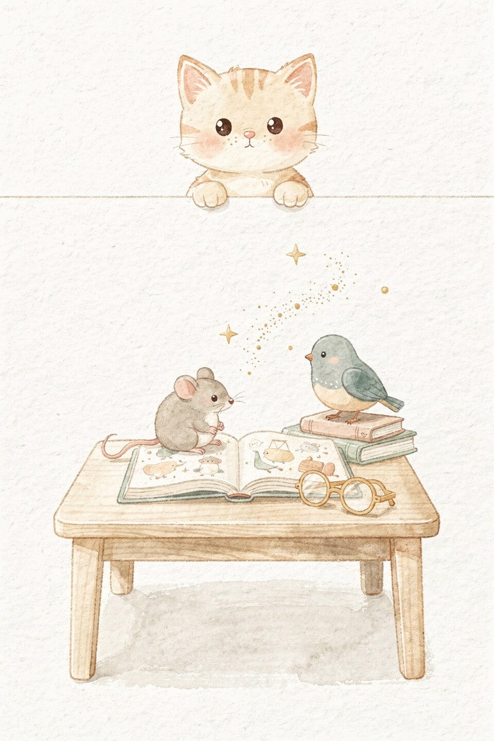 Katje dat over de rand kijkt, houten tafeltje, open prentenboek, muis op het boek, vogeltje op een stapel boeken, ronde bril, subtiele sterretjes, zachte schaduwen