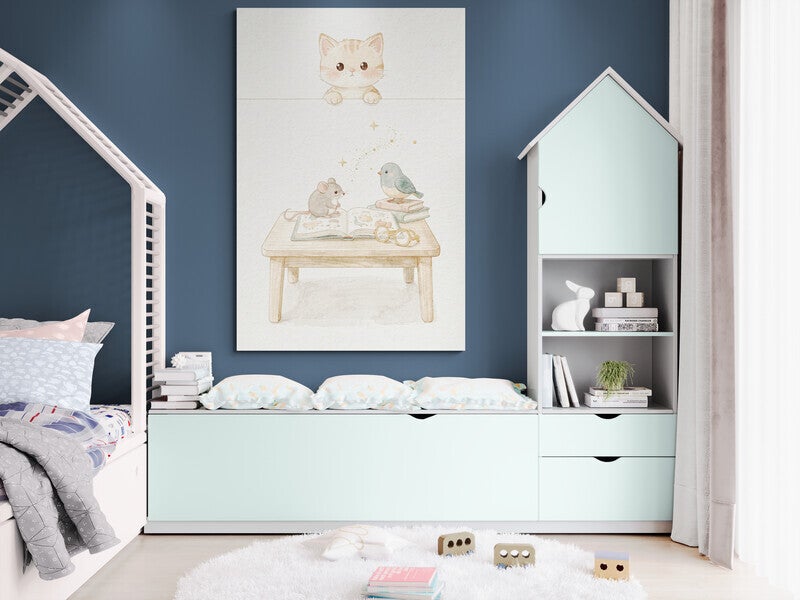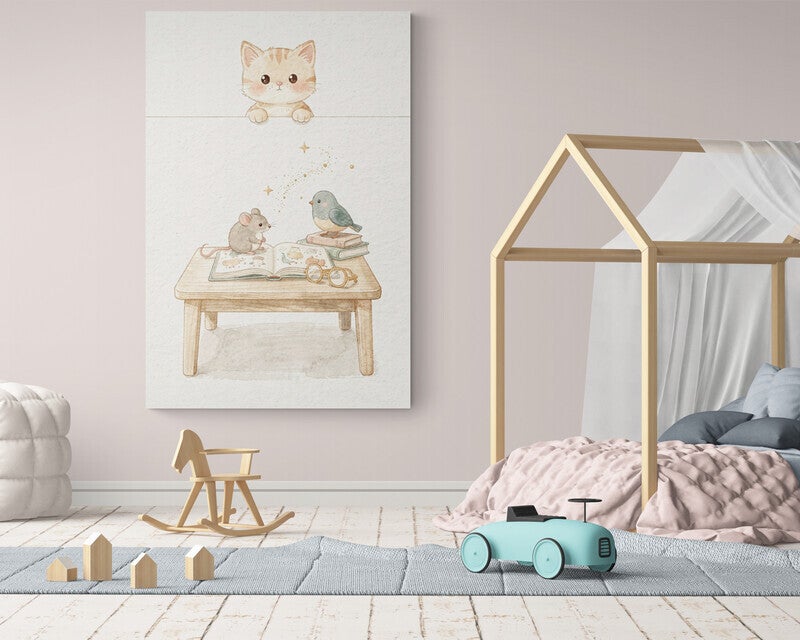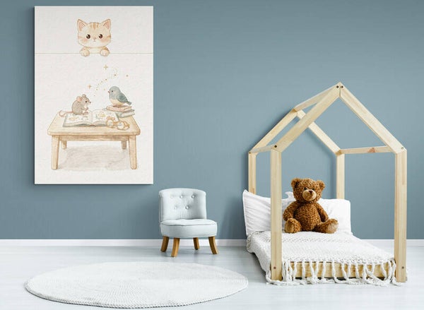 Een teder en rustgevend kunstwerk waarin een klein katje nieuwsgierig over de rand meekijkt naar een muisje en vogeltje die samen een prentenboek ontdekken. De zachte handgeschilderde look, het houten tafeltje en de subtiele gouden sterretjes geven dit schilderij een warme, dromerige uitstraling die perfect past in een babykamer of kinderkamer.