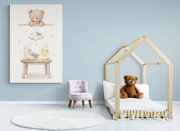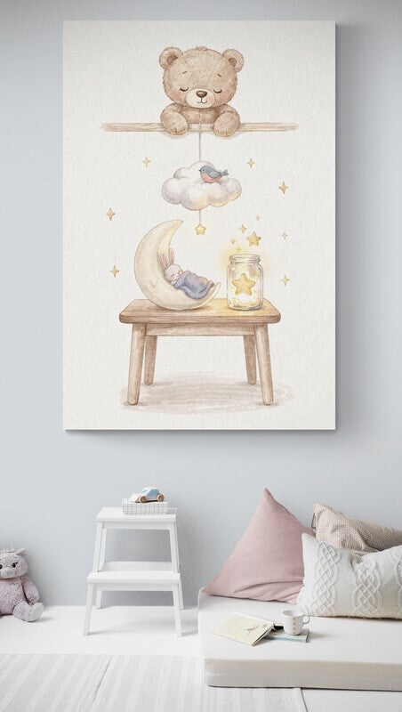 Een liefdevol en rustgevend kunstwerk waarin een klein konijntje heerlijk slaapt op een halve maan, terwijl bovenaan een zachte beer toekijkt. Het warme licht uit het glazen potje met sterretje en de subtiele gouden details geven dit schilderij een geborgen, dromerige sfeer – perfect voor een babykamer of kinderkamer.