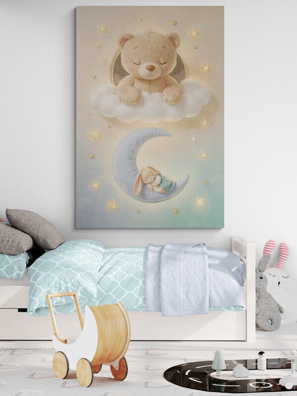 Een warm en rustgevend schilderij waarin een slapend konijntje op een zachte blauwe maan ligt, terwijl een knuffelbeer op een wolkje erboven waakt. De sterretjes en gouden gloed geven het kunstwerk een geborgen, dromerige sfeer die perfect past in een babykamer of kinderkamer.