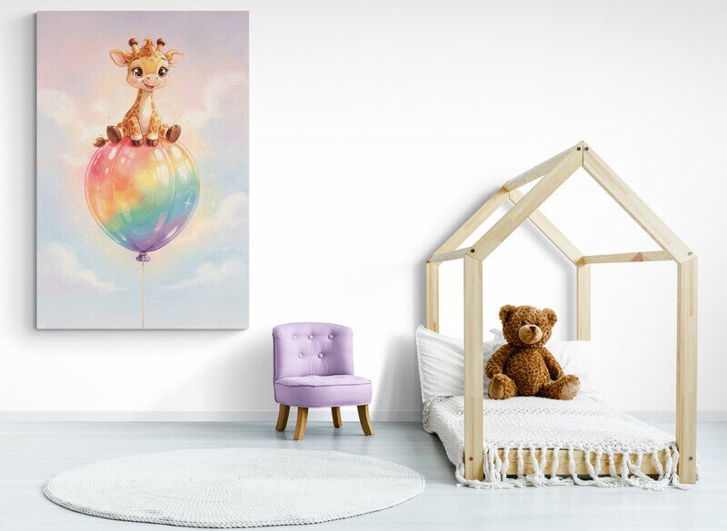 Baby giraf op regenboogballon – schilderij kinderkamer