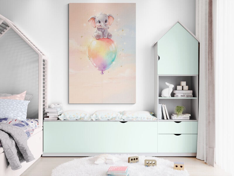 Baby olifant op regenboogballon – schilderij kinderkamer