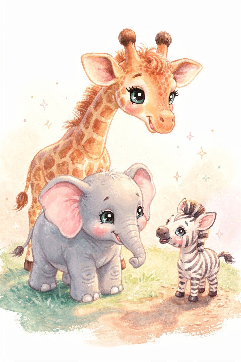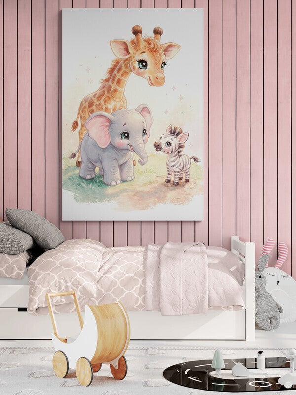 Olifant giraf zebra schilderij kinderkamer – Lieve safari dieren in zachte pasteltinten