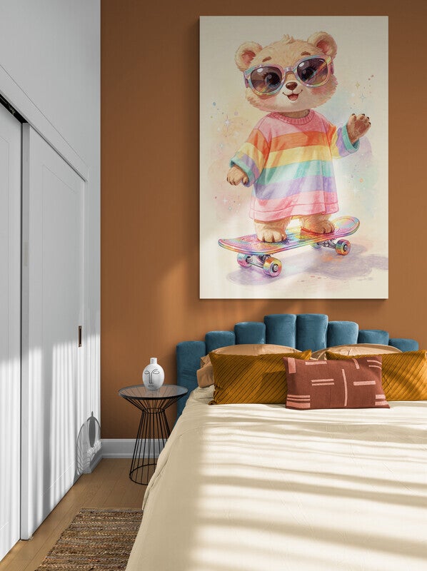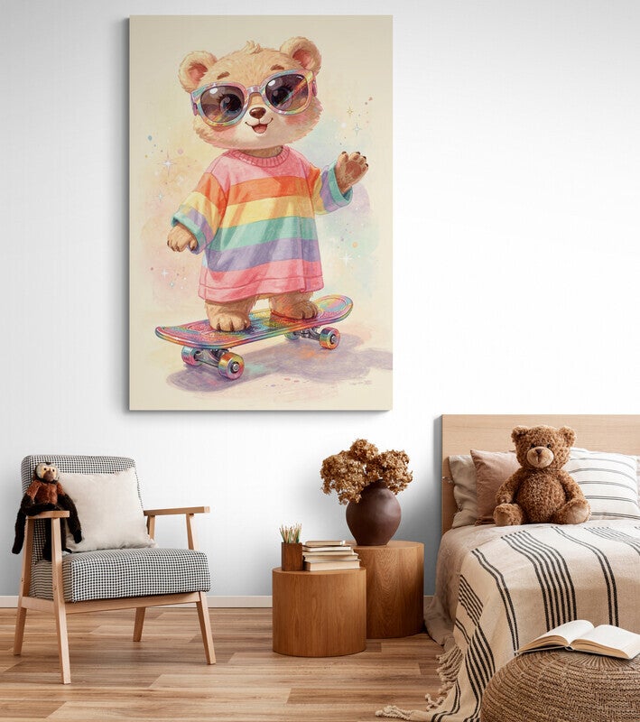 Een vrolijk en eigenzinnig schilderij van een schattige beer op een skateboard, gekleed in een oversized regenboogtrui en grote glitterzonnebril. De speelse houding en zachte handgeschilderde look maken dit kunstwerk perfect voor een kleurrijke babykamer, kinderkamer of stoere tienerkamer. Een echte blikvanger voor een ruimte vol fantasie en plezier.