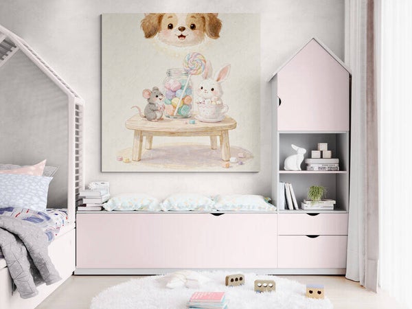 Een lief en dromerig schilderij waarin een muisje en een konijntje samen genieten van een snoeppot vol zachte pasteltinten en een grote kleurrijke lolly. Boven hen kijkt een vrolijk puppyhoofdje mee, wat zorgt voor een speelse en beschermende sfeer. De warme kleuren en de zachte uitstraling maken dit kunstwerk perfect voor een kinderkamer of een gezellige speelhoek waar fantasie en vrolijkheid samenkomen.