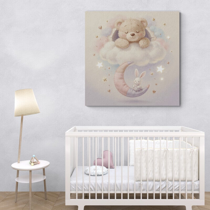 Een liefdevol en dromerig kinderkamer schilderij waarop een zacht konijntje rust op een halve maan terwijl een slapende teddybeer toekijkt vanuit een wolk. De warme pasteltinten en fonkelende sterretjes zorgen voor een rustige en geborgen sfeer. Perfect als wanddecoratie boven een bedje, commode of in een gezellige speelhoek en een prachtige toevoeging aan zowel een babykamer als kinderkamer.