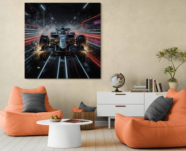 Een krachtig en modern schilderij van een formule 1 race auto die met hoge snelheid door een futuristische stad rijdt. De lichtstrepen, vonken en diepe contrasten zorgen voor een spectaculair gevoel van beweging en energie. Perfect voor liefhebbers van autosport, gaming en een stoer interieur.