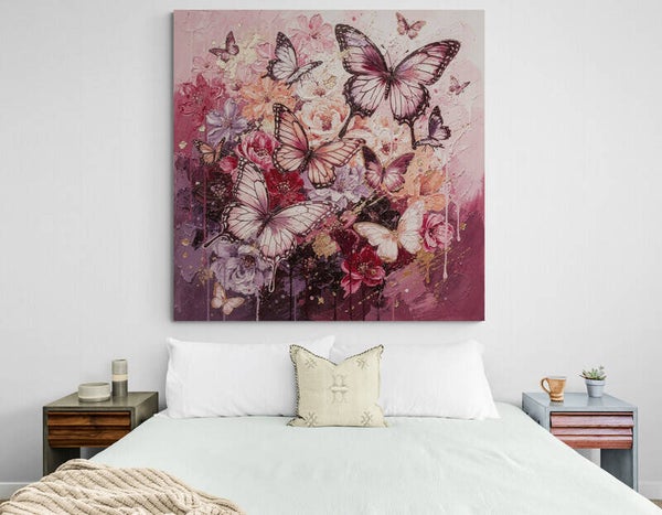 Een elegant en dromerig kunstwerk waarin sierlijke vlinders dansen boven een rijke bloemencompositie in warme roze- en paarstinten. De gelaagde verfstreken, subtiele goudaccenten en zachte overgangen geven het schilderij een luxe en romantische uitstraling. Perfect als blikvanger in een meidenkamer, tienerkamer, stijlvolle slaapkamer of een vrouwelijk interieur met hotel chic of boho sfeer.