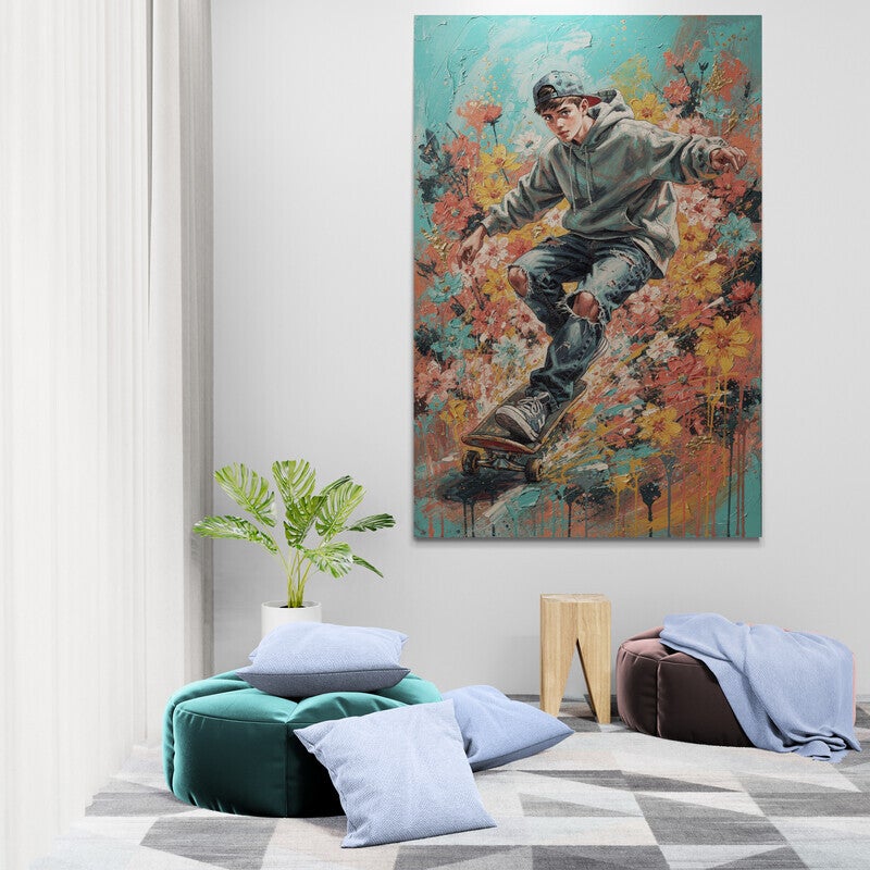 Een energiek en modern kunstwerk van een skateboardende jongen in een explosie van kleur en bloemen. De combinatie van streetstyle, beweging en verfspatten geeft het schilderij een stoere en creatieve uitstraling. Perfect voor een tienerkamer, jongenskamer of een urban gamehoek waar dynamiek en persoonlijkheid samenkomen.
