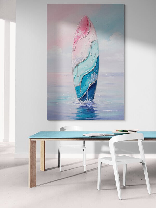 Dit zachte en dromerige surfboard schilderij in pastelkleuren brengt een kalme beach sfeer in de ruimte. De vloeiende kleurbanen in roze, turquoise en diepblauw lopen in elkaar over als golven op zee, terwijl het board uit het water omhoog komt. Perfect voor een tienerkamer, meidenkamer, strandhuis of een licht en modern interieur.