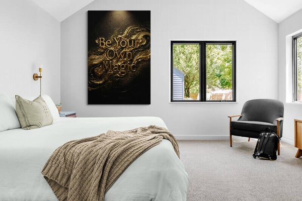 Een krachtig en stijlvol schilderij met de tekst Be Your Own Magic in glanzende goudtinten op een diepe zwarte achtergrond. De rijke structuur en de speelse goudaccenten geven het kunstwerk een luxe en moderne uitstraling. Dit schilderij is perfect voor een tienerkamer, slaapkamer of een volwassen interieur waar sfeer, motivatie en elegantie samenkomen.