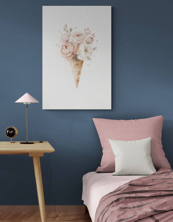Een speels en dromerig schilderij waarin een ijshoorntje is gevuld met zachte bloemen in poederroze en crème tinten. De subtiele goudaccenten en vloeiende kleurovergangen geven het kunstwerk een elegante en lichte uitstraling. De waterverflook op een achtergrond met aquarelpapierstructuur zorgt voor een rustige, romantische sfeer die perfect past in een stijlvolle tienerkamer.