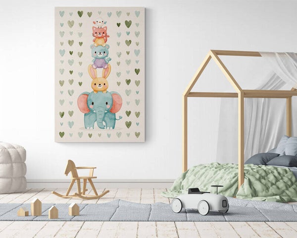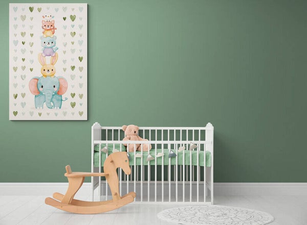 Een vrolijk en rustgevend schilderij voor de kinderkamer met een stapel lieve dieren in zachte pastelkleuren en een achtergrond vol speelse hartjes in groentinten. De matte uitstraling en subtiele papierstructuur geven het kunstwerk een warme en dromerige sfeer aan de muur. Perfect als wanddecoratie voor een babykamer, peuterkamer of speelhoek en prachtig te combineren met een Scandinavische, moderne of kleurrijke kinderkamer. De zachte kleuren zorgen voor balans in de ruimte en maken dit schilderij geschikt voor zowel een jongens- als meisjeskamer. Mooi boven een bedje, commode of in een gezellige speelhoek.