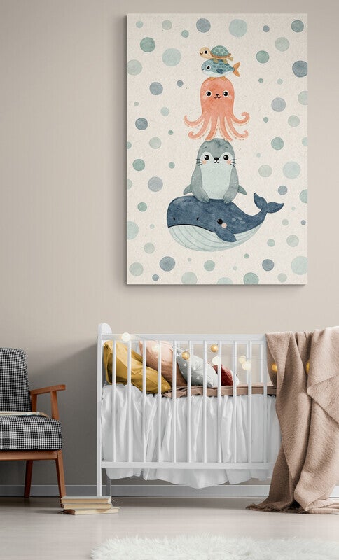 Een zacht en dromerig schilderij voor de kinderkamer met een stapel lieve zeedieren op een speelse achtergrond met ronde vormen in zeegroene tinten. De matte uitstraling en subtiele papierstructuur geven het kunstwerk een rustige en warme sfeer aan de muur. Perfect als wanddecoratie voor een babykamer, peuterkamer of speelhoek en prachtig te combineren met een Scandinavische, moderne of oceaan-thema kinderkamer. De kalme kleuren zorgen voor balans in de ruimte en maken dit schilderij geschikt voor zowel een jongens- als meisjeskamer. Mooi boven een bedje, commode of in een gezellige speelhoek.