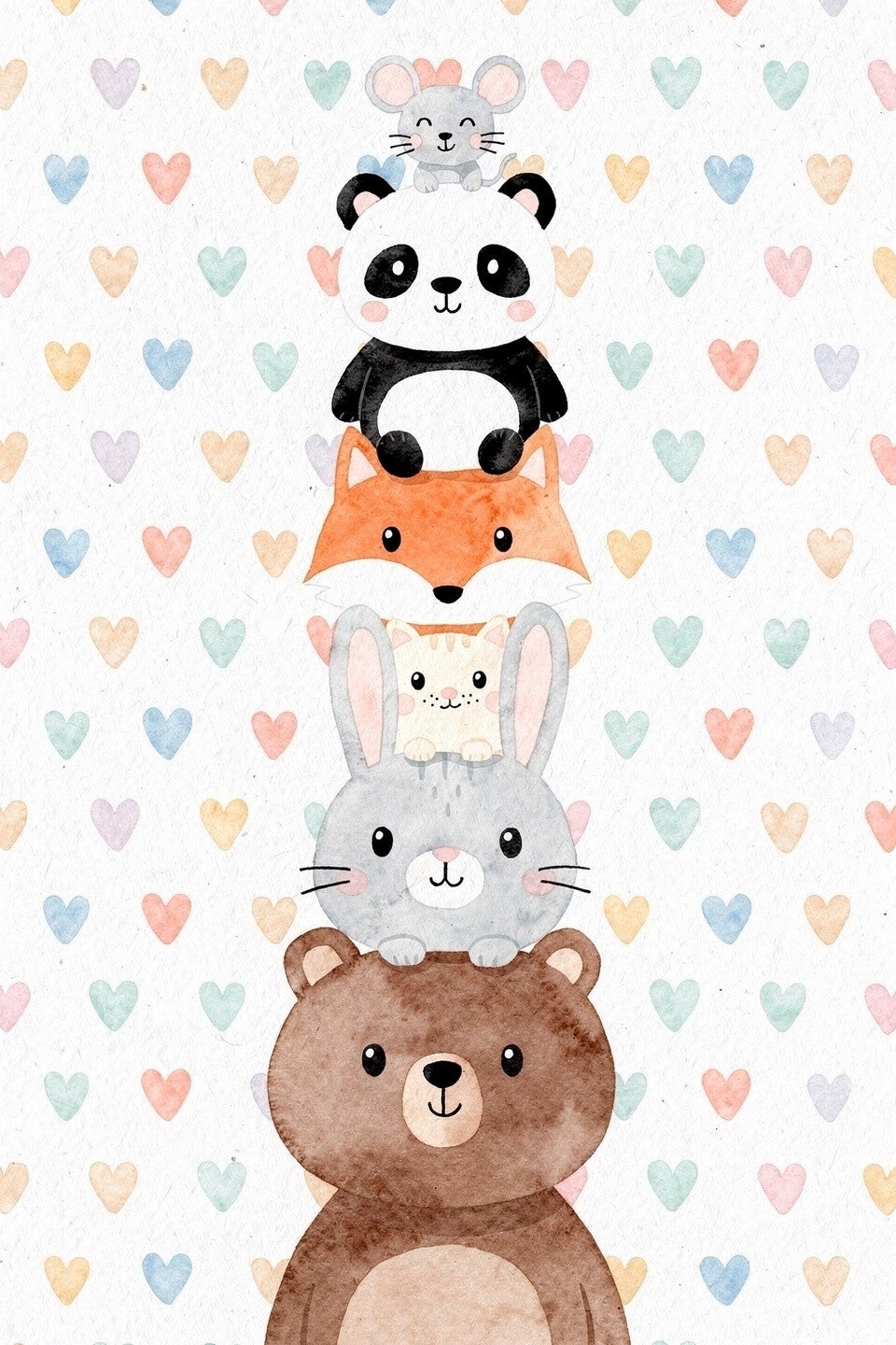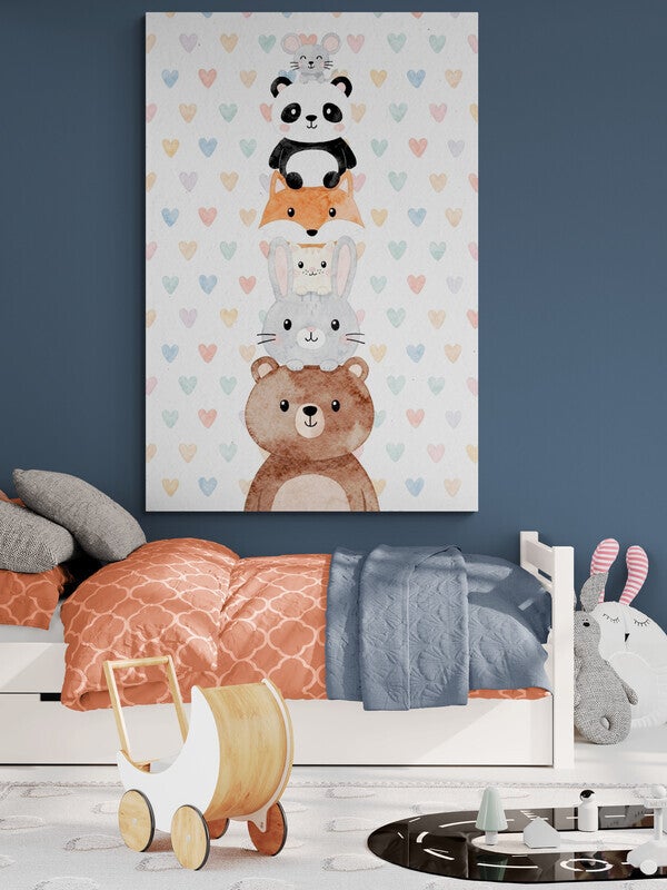 Een vrolijk en zacht schilderij voor de kinderkamer met een stapel lieve bosdieren tegen een speelse achtergrond vol pastelkleurige hartjes. De matte uitstraling en subtiele papierstructuur geven het kunstwerk een warme en dromerige sfeer aan de muur. Perfect als wanddecoratie voor een babykamer, peuterkamer of speelhoek en prachtig te combineren met een Scandinavische, moderne of kleurrijke kinderkamer. De zachte tinten brengen rust en maken dit schilderij geschikt voor zowel een jongens- als meisjeskamer. Mooi boven een bedje, commode of in een gezellige speelhoek.