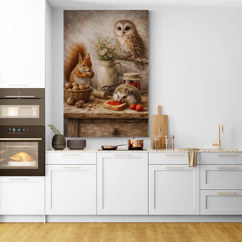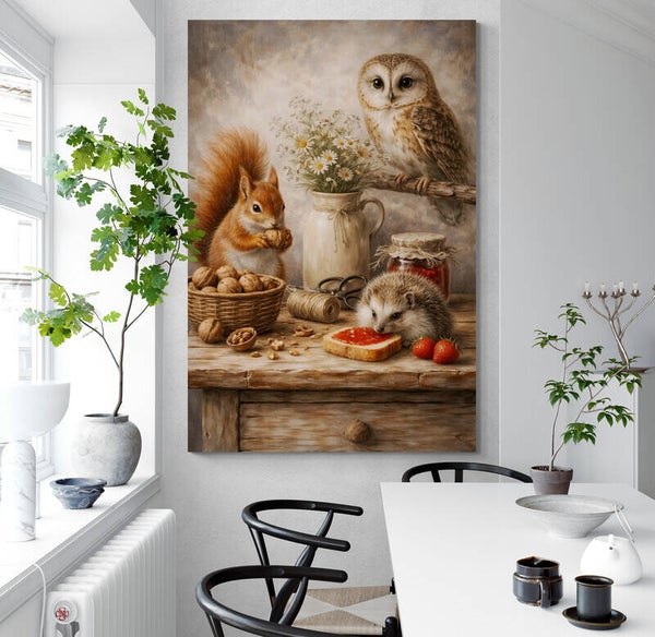 Een warm en verhalend schilderij waarin een uil, eekhoorn en egel samenkomen rond een rijk gevuld ontbijt. Terwijl de eekhoorn een noot vasthoudt en de egel geniet van een broodje met jam, waakt de uil rustig vanaf een tak. De combinatie van dieren, noten, bloemen en aardbeien geeft dit tafereel een huiselijke en landelijke uitstraling vol detail en karakter.