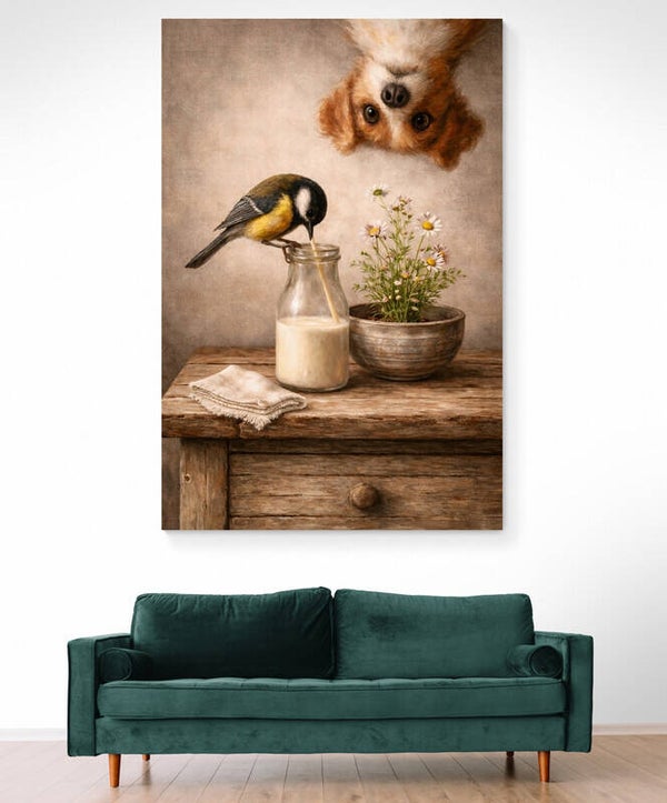 In dit sfeervolle schilderij ontstaat een rustig tafelmoment waarin een vogel nieuwsgierig drinkt uit een melkfles terwijl een hond speels van bovenaf meekijkt. Naast de fles staat een potje met veldbloemen dat het tafereel een natuurlijke en warme uitstraling geeft. De combinatie van dierlijke nieuwsgierigheid en landelijke eenvoud zorgt voor een charmant beeld dat meteen een glimlach oproept. De zachte linnenstructuur geeft het kunstwerk een authentieke, schilderachtige uitstraling die prachtig past in een gezellig interieur.