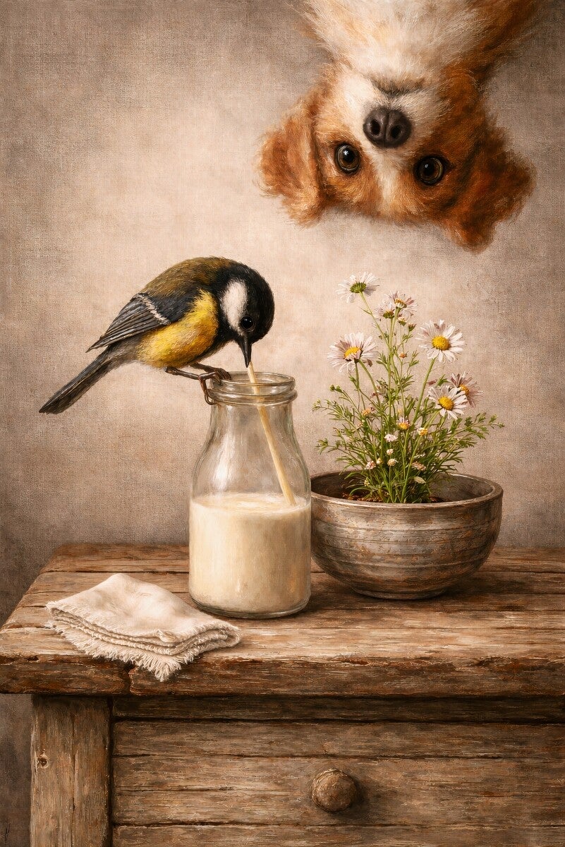vogel drinkt uit melkfles, hond kijkt nieuwsgierig van bovenaf, bloemen in rustieke pot, houten tafel, landelijke sfeer, zachte linnenstructuur, zichtbare oude canvasstructuur, natuurlijke compositie met dieren, warm tafereel voor keuken of woonkamer