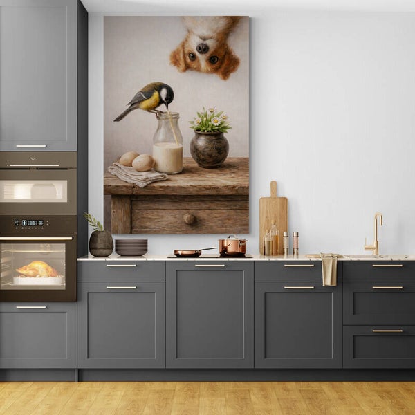 Dit sfeervolle schilderij laat een rustig keukentafereel zien waarin een vogel uit een melkfles drinkt terwijl een hond nieuwsgierig van bovenaf meekijkt. Op de houten tafel liggen eieren op een zachte doek en naast de melkfles staat een pot met kleine veldbloemen. Het geheel voelt warm en landelijk, alsof het moment zich afspeelt in een rustige boerderijkeuken. De zichtbare oude canvasstructuur in de achtergrond geeft het kunstwerk een authentieke, schilderachtige uitstraling en versterkt de nostalgische sfeer.