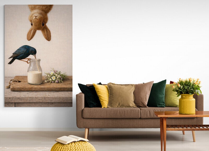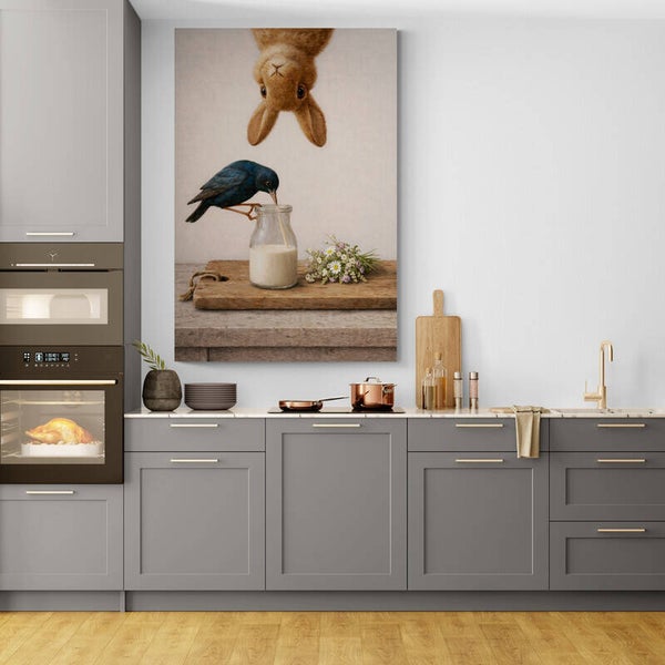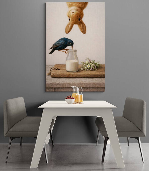 In dit sfeervolle schilderij ontstaat een rustig tafelmoment waarin een vogel uit een melkfles drinkt terwijl een nieuwsgierig konijn van bovenaf meekijkt. Op de houten plank naast de fles ligt een klein boeketje veldbloemen dat het tafereel een frisse, landelijke uitstraling geeft. De combinatie van dieren, eenvoudige keukenelementen en zachte kleuren zorgt voor een warm en charmant beeld dat goed past in een gezellige keuken of landelijke woonruimte. De achtergrond heeft een duidelijk zichtbare canvas- en linnenachtige structuur, waardoor het kunstwerk een authentieke schilderachtige uitstraling krijgt.