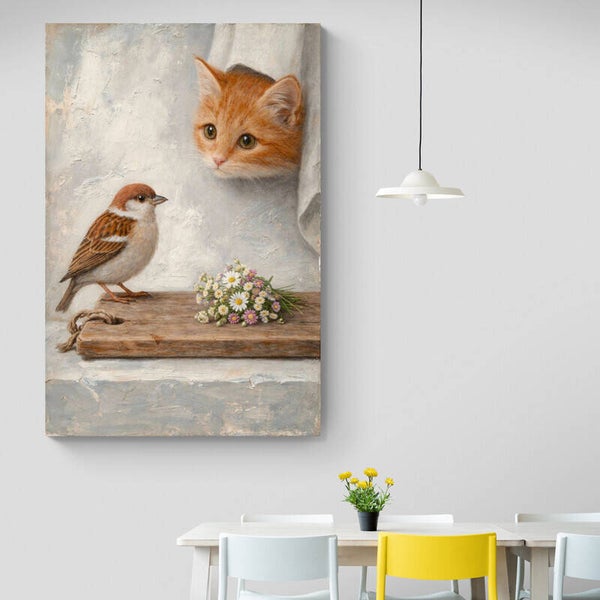 Een sfeervol en schilderachtig kunstwerk waarin een nieuwsgierige kat voorzichtig kijkt naar een kleine vogel op een houten plank. De rustige compositie en zachte vormen zorgen voor een kalme en warme uitstraling. De duidelijke schilderstructuur in de achtergrond geeft het werk een tastbaar en levendig karakter, waardoor het zowel in een landelijk als modern interieur prachtig tot zijn recht komt.