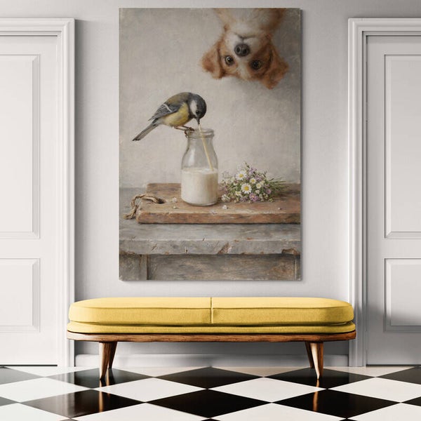 Een rustig en schilderachtig kunstwerk waarin een vogel voorzichtig drinkt uit een glazen fles, terwijl een nieuwsgierige hond van boven meekijkt. De zachte compositie en het subtiele spel tussen de elementen zorgen voor een kalme, warme uitstraling. Het geheel voelt stil en verfijnd, met een natuurlijke harmonie die perfect past in een sfeervol interieur.