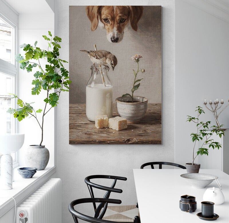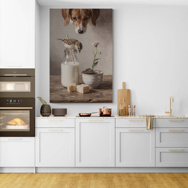 Dit sfeervolle schilderij toont een rustig tafelmoment waarin een mus op een melkfles balanceert terwijl een nieuwsgierige hond van bovenaf meekijkt. Op de houten tafel staan daarnaast een kleine bloem in een aardewerken potje en een paar stukken kaas die het tafereel een warme boerderijkeuken-sfeer geven. De combinatie van dieren, eenvoudige ingrediënten en natuurlijke materialen zorgt voor een charmant en landelijk beeld. De achtergrond heeft een geschilderde verf- en stucachtige structuur die het kunstwerk een authentieke, schilderachtige uitstraling geeft.