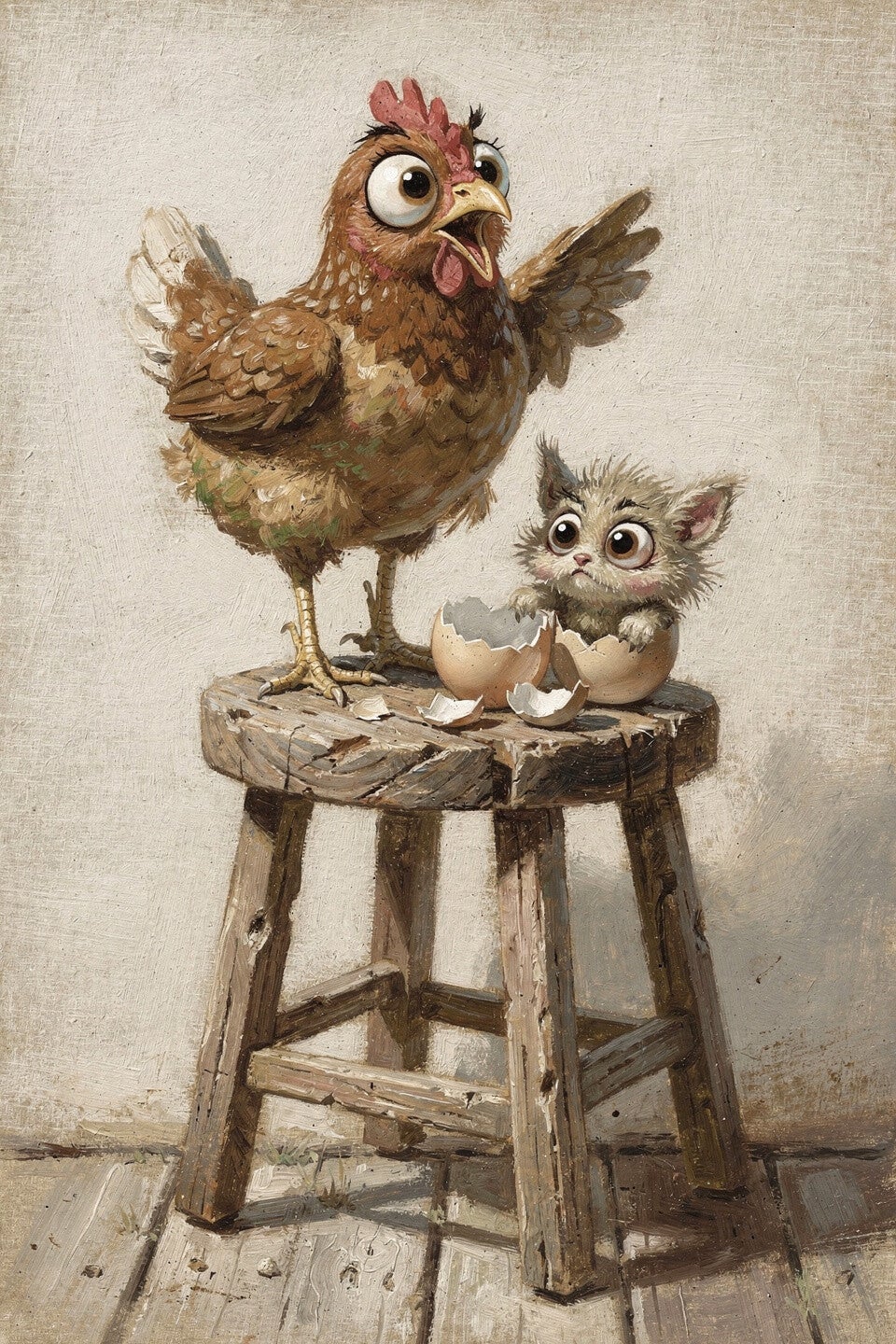 Dit humoristische schilderij laat een verrassend moment zien waarin een kleine kitten uit een ei lijkt te zijn gekropen terwijl een verbaasde kip ernaast staat. De kip kijkt met grote ogen alsof ze zelf ook niet begrijpt hoe dit mogelijk is. Het tafereel speelt zich af op een rustiek houten krukje dat het geheel een speelse boerderijsfeer geeft. De combinatie van dieren en het onverwachte moment zorgt voor een vrolijk en luchtig kunstwerk dat meteen de aandacht trekt. De achtergrond heeft een geschilderde verf- en stucachtige structuur waardoor het schilderij een levendige en handgeschilderde uitstraling krijgt.