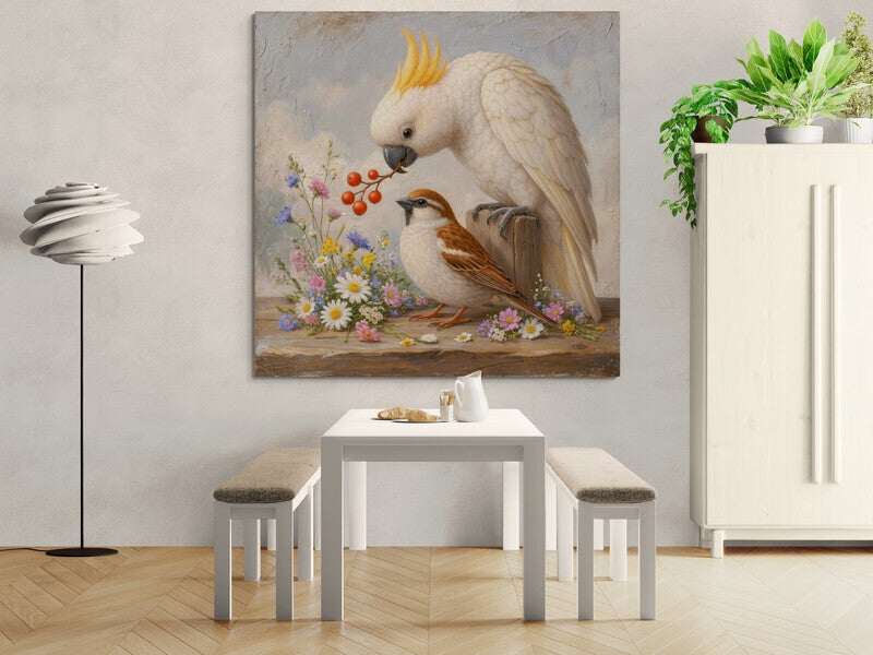 Zacht Samenzijn – schilderij kaketoe en mus met bloemen