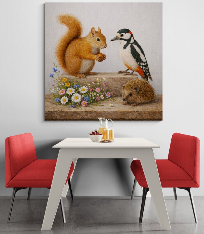 Dit sfeervolle schilderij laat een rustige ontmoeting uit het bos zien. Een eekhoorn zit met een noot in zijn pootjes terwijl een specht nieuwsgierig tegenover hem staat. Onderaan kijkt een kleine egel rustig toe tussen een veld van kleurrijke bloemen. De combinatie van bosdieren en veldbloemen geeft het tafereel een warme en natuurlijke uitstraling. De achtergrond heeft een linnenachtige structuur die het kunstwerk een zachte en rustige sfeer geeft.