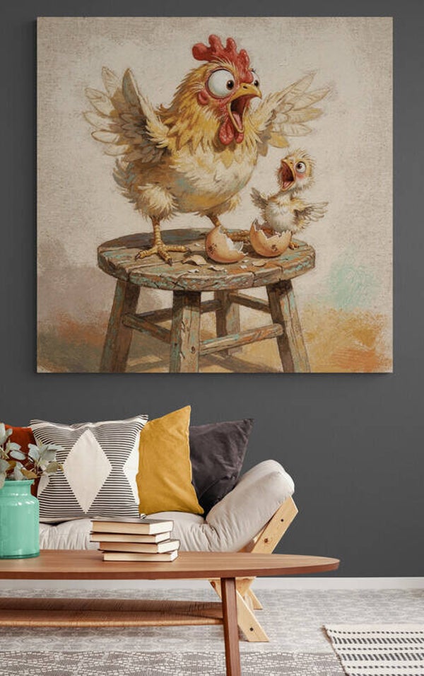 Dit humoristische schilderij laat een komisch moment zien waarin een kuiken net uit zijn ei is gekomen terwijl de kip ernaast met grote ogen reageert. Beide lijken even verrast door wat er zojuist is gebeurd. De speelse uitdrukking en overdreven houdingen geven het tafereel een vrolijke en levendige uitstraling. Het rustieke houten krukje versterkt de landelijke sfeer van het schilderij. De achtergrond heeft een ruwe verf- en stucachtige structuur met zichtbare penseelstreken, wat het kunstwerk een handgeschilderd karakter geeft.