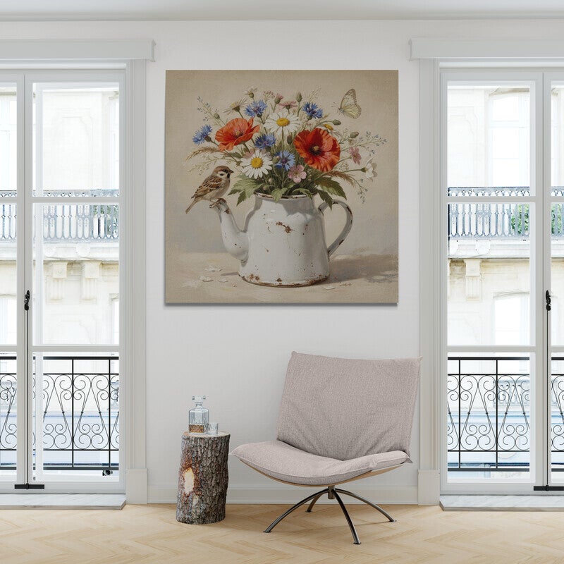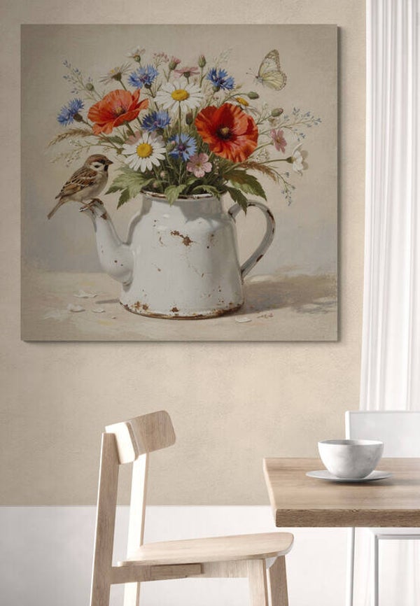 Dit landelijke schilderij toont een boeket veldbloemen in een oude emaillen theepot. Tussen de bloemen zoals margrietachtige bloemen, klaproosachtige bloemen en blauwe korenbloemen zit een klein musje op de tuit van de pot. Naast het boeket zweeft een lichte vlinder door de rustige achtergrond. De combinatie van bloemen, vogel en het verweerde email geeft het beeld een warme en natuurlijke uitstraling die goed past bij een landelijk interieur.