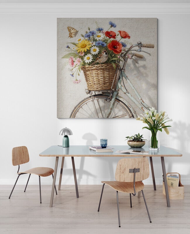 Landelijke wanddecoratie met bloemen, vogels en vintage elementen past perfect bij een landelijk interieur. Denk bijvoorbeeld aan een schilderij met veldbloemen in een rieten mand op een oude fiets. Deze natuurlijke en rustieke elementen zorgen voor een warme en rustige sfeer in huis.