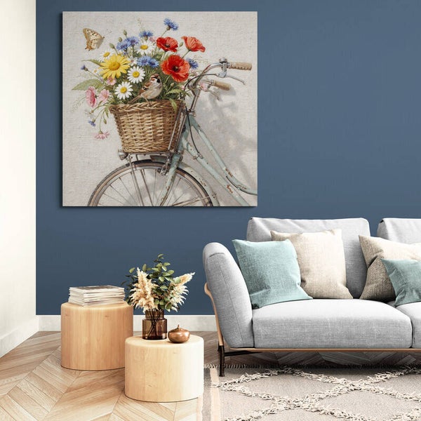 Dit landelijke schilderij toont een oude fiets met een rieten mand vol veldbloemen. In de mand groeien margrietachtige bloemen, klaproosachtige bloemen en blauwe korenbloemen die speels naar buiten buigen. Op de rand van de mand zit een klein musje terwijl een vlinder langs de bloemen zweeft. De combinatie van de vintage fiets, de bloemen en de zachte achtergrond geeft het beeld een rustige en warme uitstraling die perfect past bij een landelijk interieur.