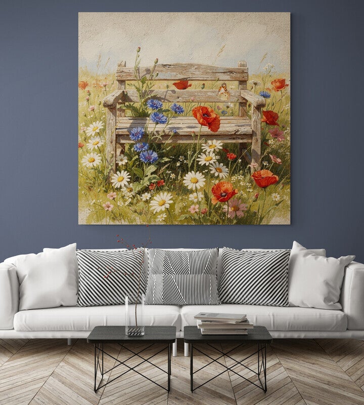 Dit landelijke schilderij toont een oud houten tuinbankje midden in een veld vol bloemen. Rond het bankje groeien margrietachtige bloemen, klaproosachtige bloemen en blauwe korenbloemen die speels tussen het gras omhoogkomen. Een vlinder rust op het bankje terwijl de bloemen zacht in het zonlicht staan. De verweerde houten planken en de natuurlijke bloemen geven het beeld een warme en rustige uitstraling die perfect past bij een landelijk interieur.