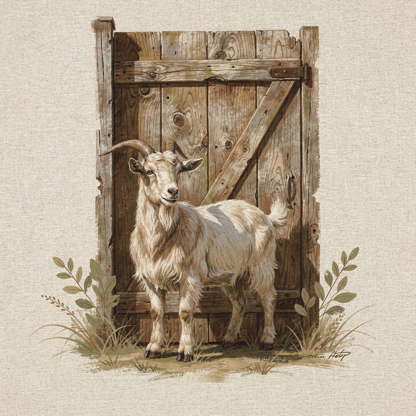 geit, houten schuurdeur, rustiek hout, landelijke boerderij sfeer, natuurlijke omgeving, subtiele handtekening in het kunstwerk