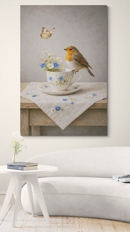 Een charmant en rustig tafereel waarin een roodborstje op de rand van een bloemrijk kopje zit, terwijl een vlinder erboven zweeft. Het kopje is gevuld met kleine veldbloemen die een frisse en zachte sfeer geven aan het geheel. De lichte achtergrond en het linnen doek op tafel zorgen voor een serene uitstraling, alsof de ochtend net is begonnen. Dit schilderij brengt een vrolijke, natuurlijke sfeer in een keuken, eetkamer of landelijke woonruimte.