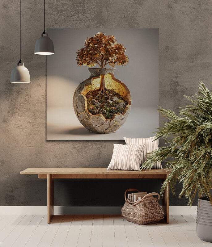Een bijzondere gebarsten vaas vormt het hart van dit kunstwerk. Binnenin ontvouwt zich een klein landschap met bloemen, stenen en een boom die vanuit de aarde omhoog groeit. Het warme licht in de vaas laat de natuur zacht oplichten en benadrukt de fijne details van de wortels, bladeren en bloeiende planten. De scheuren in het keramiek krijgen een gouden gloed waardoor het geheel een bijna magische uitstraling krijgt. Dit schilderij combineert natuur, rust en symboliek en brengt een serene sfeer in een interieur.