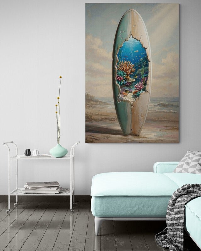 In dit kleurrijke kunstwerk lijkt een oud surfboard open te breken en een levendige onderwaterwereld te onthullen. Binnen de opening verschijnt een helder koraalrif met tropische vissen, zachte zeebellen en kleurrijke koralen. Het contrast tussen het verweerde surfboard en het levendige zeeleven geeft het kunstwerk een speelse en verrassende uitstraling. De frisse kleuren en maritieme sfeer brengen direct het gevoel van zee, zomer en vrijheid in huis.
