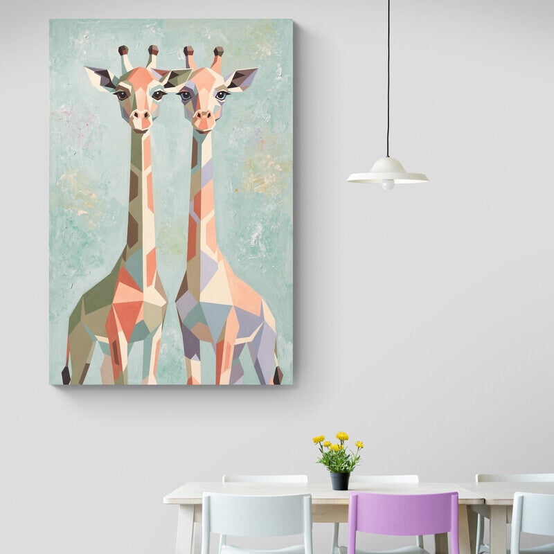 Dit dierenschilderij laat twee giraffen zien die rustig naast elkaar staan. De lange halzen en vriendelijke gezichten geven het schilderij een rustige en warme uitstraling. De giraffen zijn opgebouwd uit zachte kleurvlakken in beige, zandtinten, lichtgroen, zachtroze en lichtblauw. Hierdoor krijgt het schilderij een moderne maar rustige uitstraling. De achtergrond bestaat uit lichte mintgroene en pastelgroene tinten met zachte penseelstreken en een lichte verfstructuur. Daardoor komt het geheel rustig en luchtig over en passen de giraffen mooi in de compositie. Het schilderij brengt een kalme en natuurlijke sfeer in een ruimte.