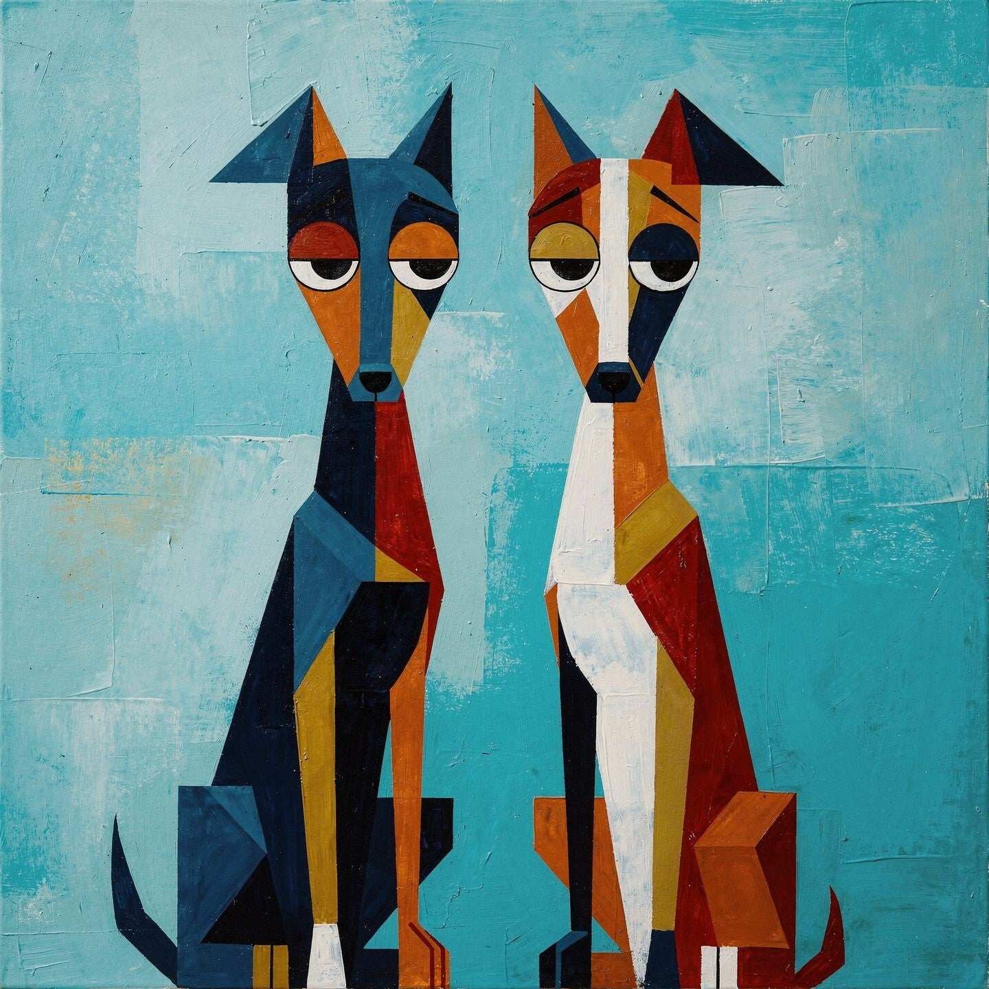Dit kunstwerk toont twee elegante honden in een moderne, grafische stijl. De vormen zijn opgebouwd uit strakke kleurvlakken waardoor het beeld een bijna sculpturale uitstraling krijgt. De rustige turquoise achtergrond laat de warme kleuren van de honden extra naar voren komen. Het kunstwerk straalt balans, rust en karakter uit en vormt een stijlvolle blikvanger aan de muur.