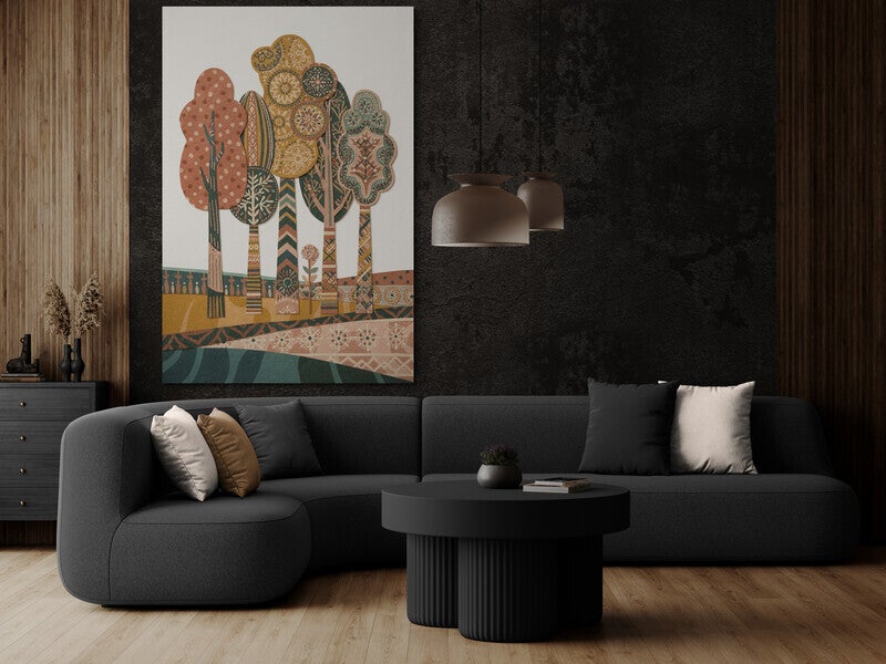Een speels en stijlvol landschap waarin decoratieve bomen samen een uniek patroon vormen. De combinatie van grafische vormen en zachte kleuren geeft dit kunstwerk een warme en creatieve uitstraling. Een bijzonder werk dat rust en karakter toevoegt aan je interieur.
