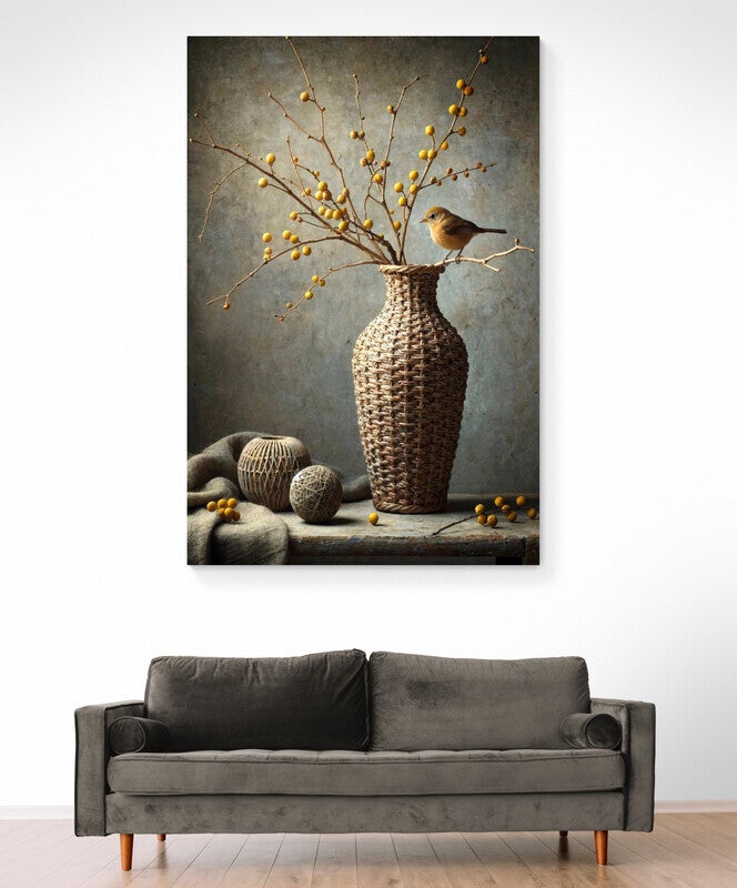 Een warm en sfeervol kunstwerk waarin een klein vogeltje rustig zit tussen fijne takken met gele besjes. De grote gevlochten vaas geeft het beeld een natuurlijke, landelijke uitstraling. De combinatie van zachte tinten, sobere achtergrond en verfijnde vormen zorgt voor een kalme en stijlvolle sfeer aan de muur.