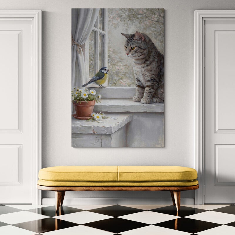 Een teder en rustig tafereel waarin een kat en een vogel elkaar ontmoeten bij het raam. De zachte kleuren en fijne details geven dit schilderij een warme en vriendelijke uitstraling.