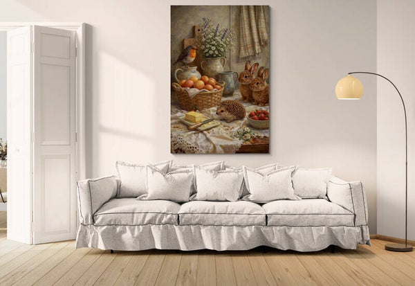 Een sfeervol en rijk gevuld schilderij waarin een landelijke keukentafel tot leven komt. Twee konijnen, een egel en een klein vogeltje delen de ruimte met vers fruit, bloemen en zachte stoffen. De warme tinten en verfijnde details zorgen voor een uitnodigende en rustige uitstraling die perfect past bij een landelijk interieur.