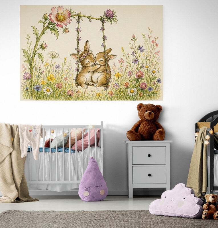 Een teder en dromerig schilderij van twee konijntjes die samen op een schommel zitten tussen kleurrijke veldbloemen. De zachte lijnen en lieve uitstraling zorgen voor een warme en rustige sfeer in elke kinderkamer of babykamer.