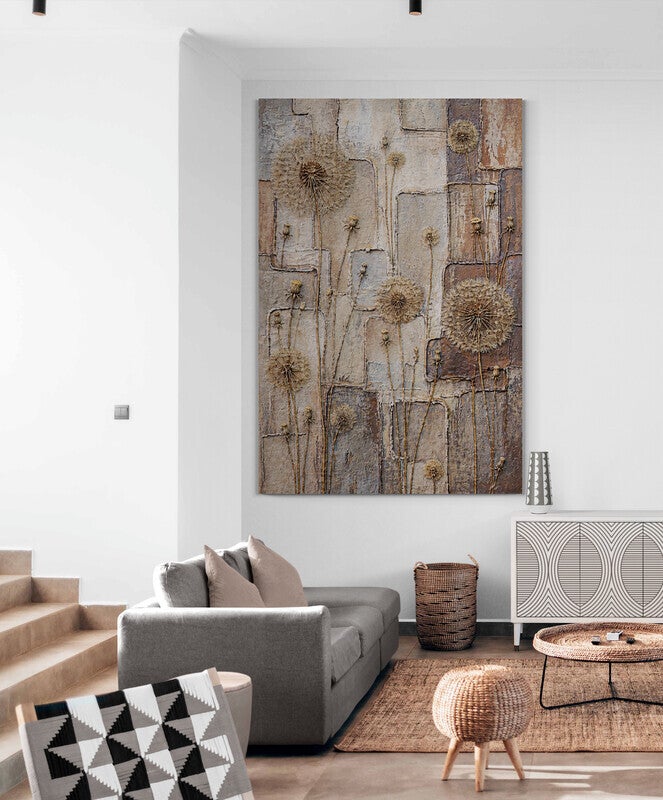 Dit sfeervolle schilderij toont verdroogde bloemen met fijne stelen tegen een achtergrond met een robuuste structuur. De natuurlijke vormen en warme aardetinten zorgen voor een rustige en tijdloze uitstraling. Het geheel voelt puur en in balans, waardoor het perfect past in een interieur waar eenvoud en natuur centraal staan.