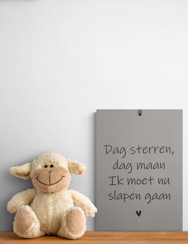 Een lief en rustgevend tekst schilderij dat perfect past bij het avondritueel. De zachte woorden “Dag sterren, dag maan, ik moet nu slapen gaan” brengen een gevoel van rust en geborgenheid, ideaal voor de babykamer of kinderkamer.