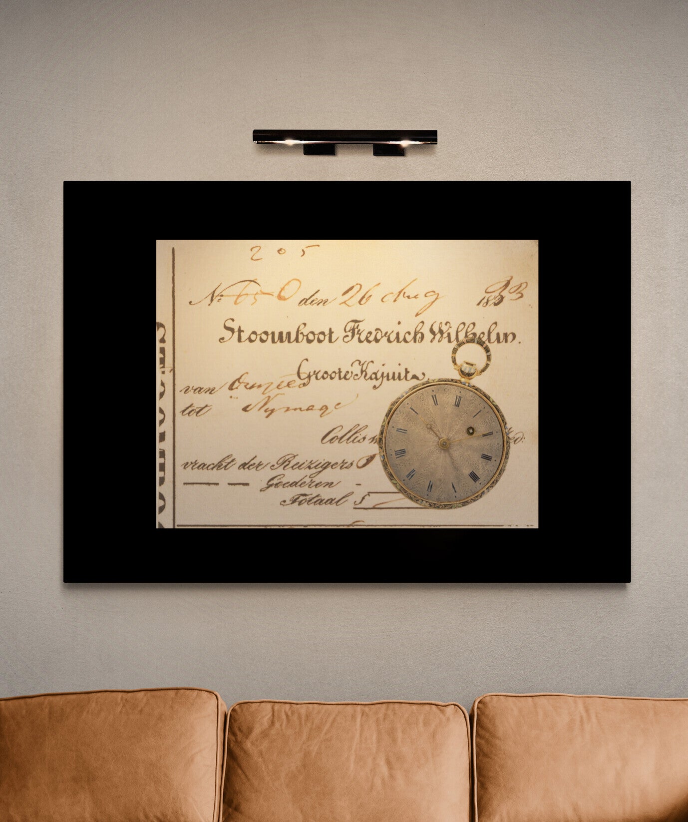 Document uit 1833 met Horloge met bloemranken, goud, zilver en email. Met zwarte achtergrond.